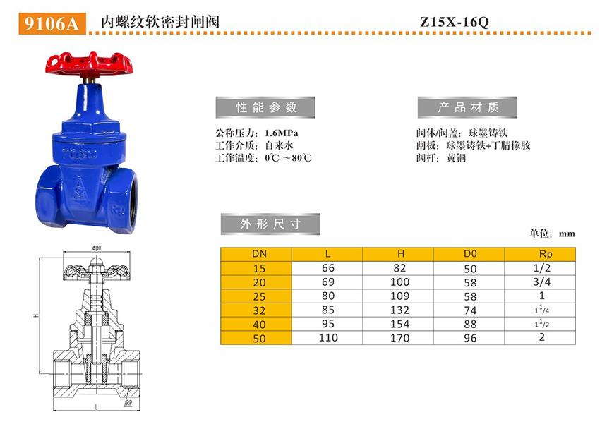 名称:内螺纹软密封闸阀 Z15X-16Q