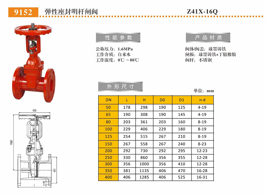 名称:弹性座封明杆闸阀 Z41X-16Q