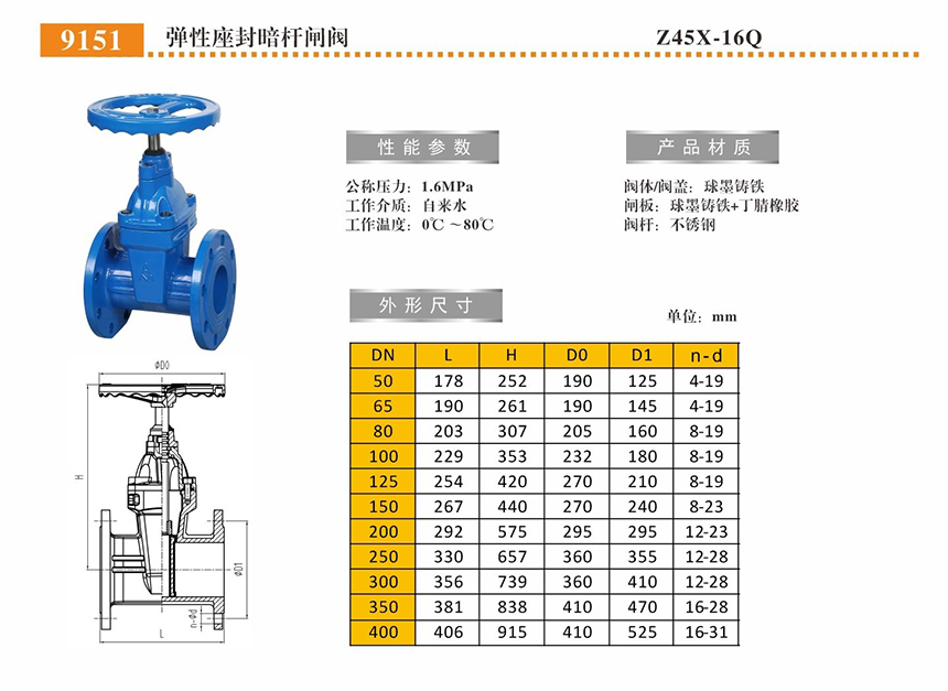 名称:弹性座封暗杆闸阀 Z45X-16Q